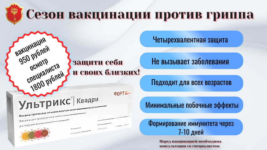 Мы рады сообщить, что в этом сезоне доступна современная вакцина Ультрикс Квадри. Она разработана с учетом последних научных достижений и обеспечивает защиту от четырех штаммов вируса гриппа. Вакцина Ультрикс Квадри безопасна и эффективна для детей с 6 месяцев, что делает ее идеальным выбором для всей семьи.