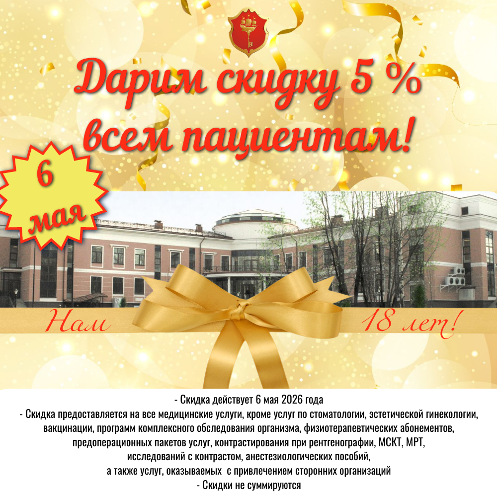 В честь праздничной даты 6 мая 2026 года для Вас действует скидка 5% на медицинские услуги!